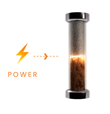Electricity converts iron oxide into iron, storing energy in solid form. When exposed to air, the reaction reverses and releases sustained high-temperature heat.